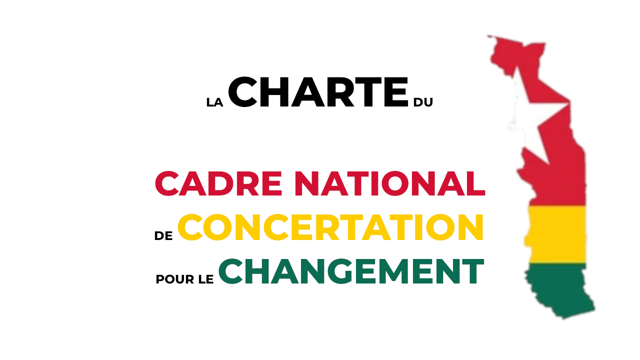 Décidons de nous rassembler dans un cadre d’action dénommé « Cadre National de Concertation pour le Changement au Togo (CNCC) et adoptons la présente Charte comme fondement de notre engagement commun.